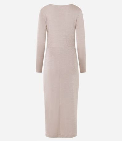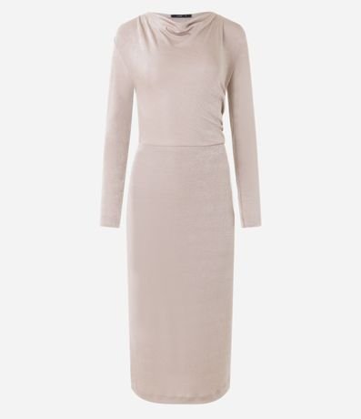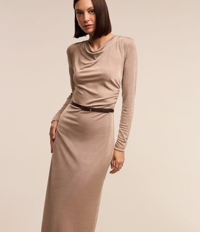 Vestido midi em malha polyvelour, com gola degagê, detalhes drapeados e superfície sem estampa.