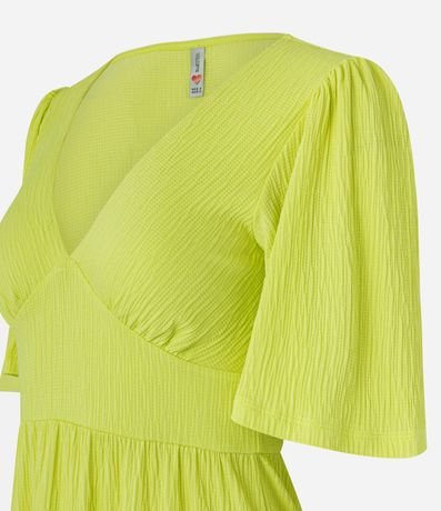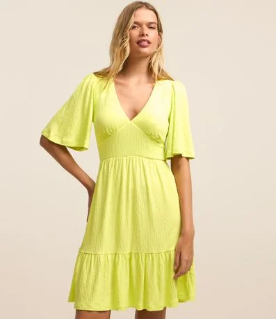 Vestido em malha texturizada, com decote v, mangas curtas godê e barra com babadinho.