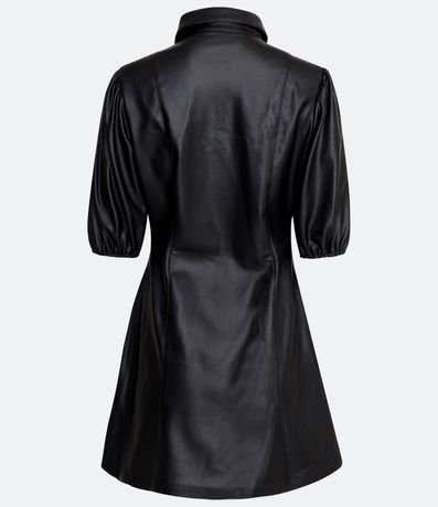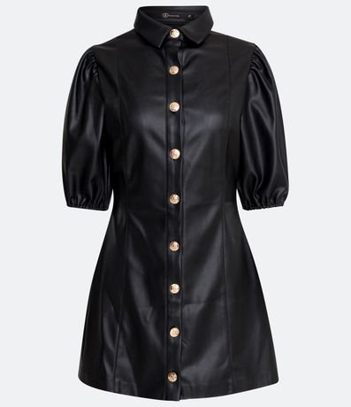 Ref: Vestido curto em material sintético, com gola colarinho, mangas curtas bufante e abotoado frontal com botões em brasão.
