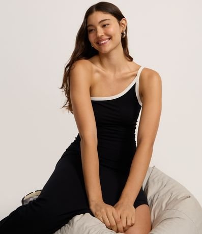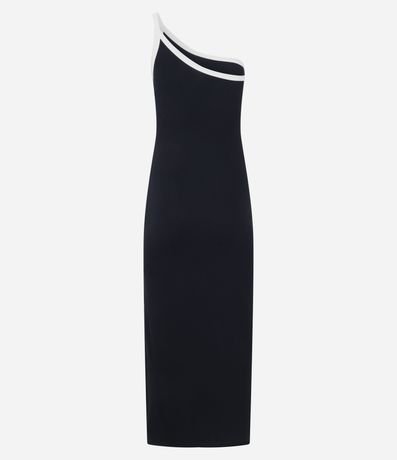 Ref: Vestido feminino confeccionado em viscose certificada mais sustentável, através de boas práticas ambientais. Possui um ombro só e viés contrastantes que contorna o decote e a alça.