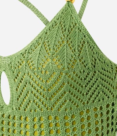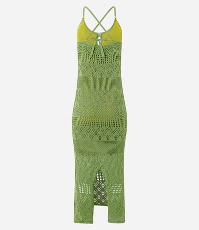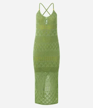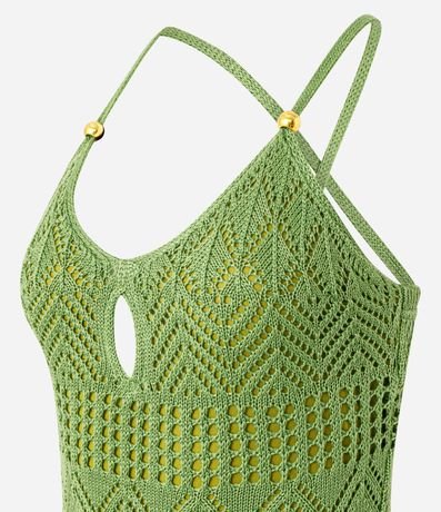 Ref: Vestido longo confeccionado em tricô com padronagem vazada e decote gota. Possui alças finas cruzadas nas costas com detalhe em contas metálicas, garantindo charme e sofisticação. Ideal para produções praianas ou eventos casuais, com caimento leve e toque artesanal.