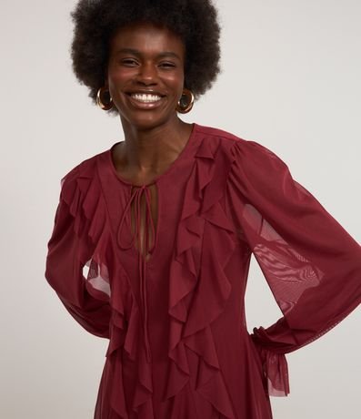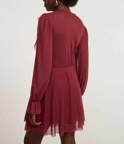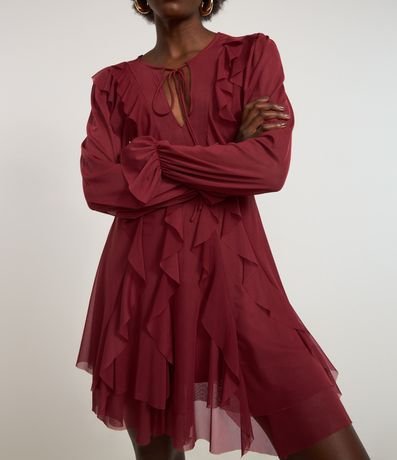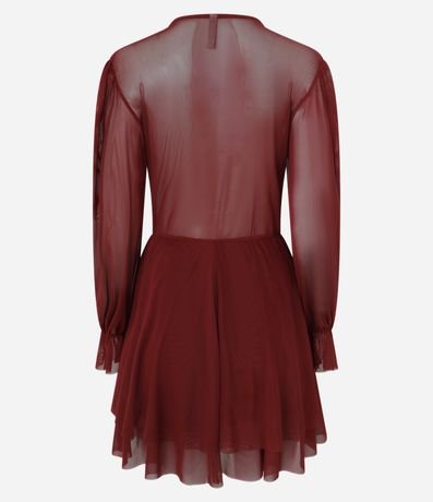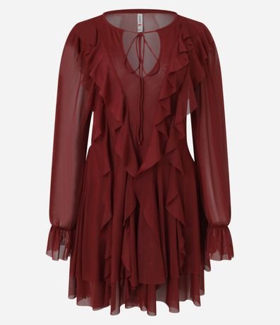 Ref: Vestido feminino de modelo curto, confeccionado em tule, com decote em U e amarração. Possui mangas longas, babados e costas com transparência.