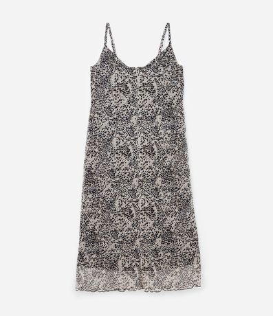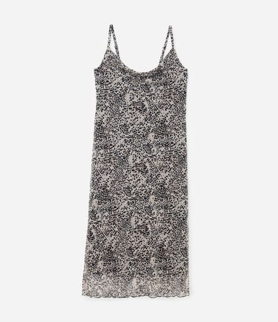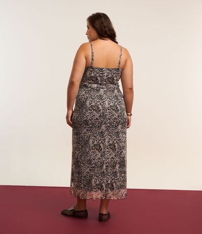 Ref: Vestido feminino curve & plus size, modelo midi, confeccionado em tule com boas práticas ambientais. Peça com decote degage, alça fina ajustável e estampa total de animal print.