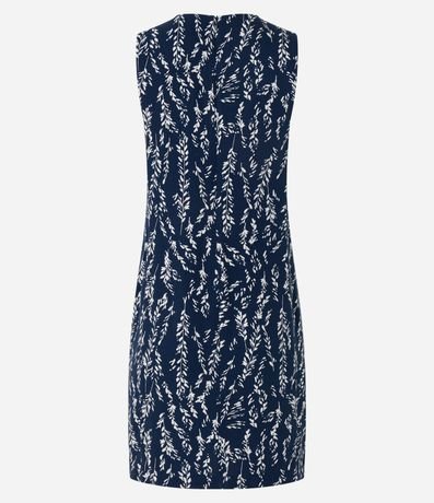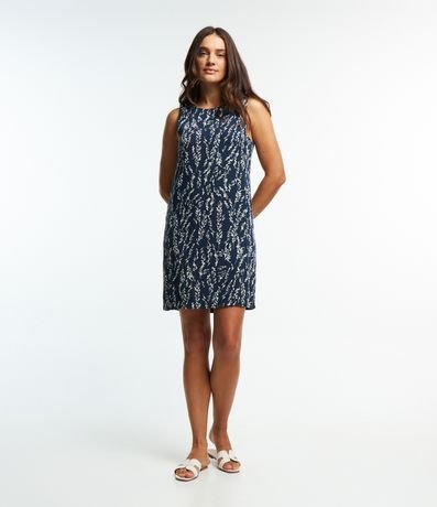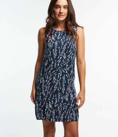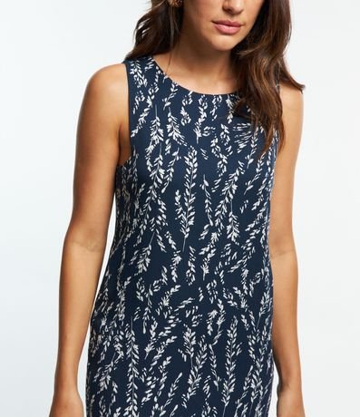 Vestido feminino, confeccionado em viscolinho, com gola redonda, sem mangas, zíper nas costas e estampa folhagens.