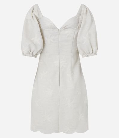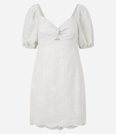 Vestido curto de mangas curtas bufantes confeccionado em viscolinho de viscose mais sustentável, busto torcido com abertura vazada logo abaixo e barra nuvem. Possui fechamento nas costas por zíper e bordados de coqueiros espalhados pela peça.