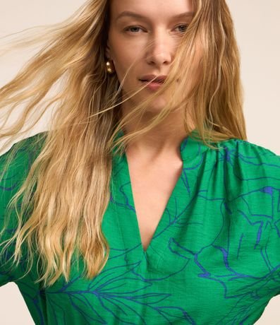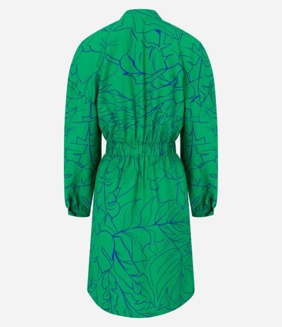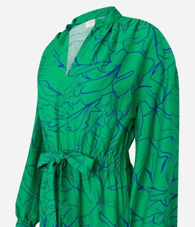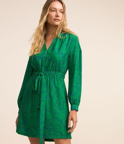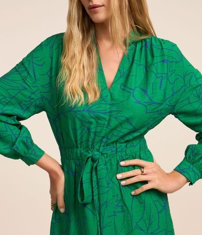 Ref: Vestido feminino, confeccionado em viscose, com gola lapela, amarração na cintura e estampa folhagens.