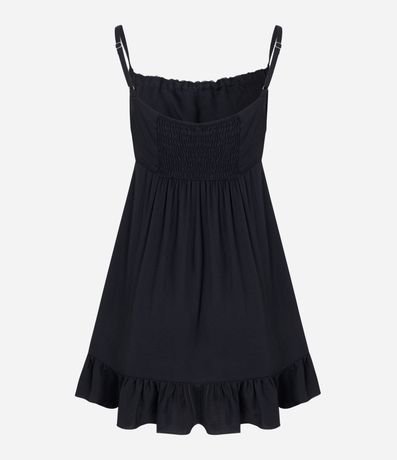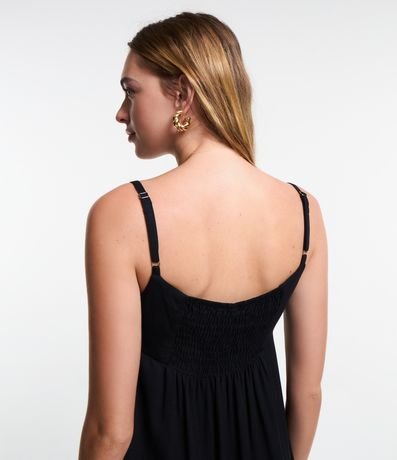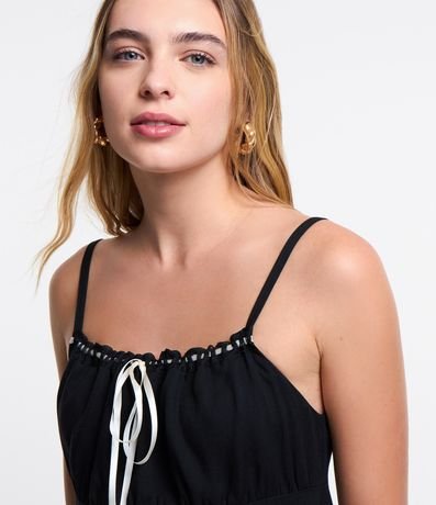 Ref: Vestido feminino, confeccionado em viscose, com amarração no decote e alças finas. A peça também conta com superfície sem estampa.