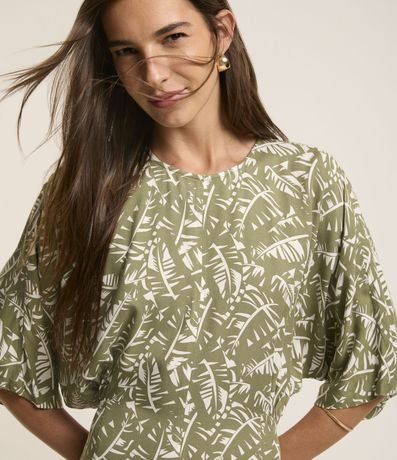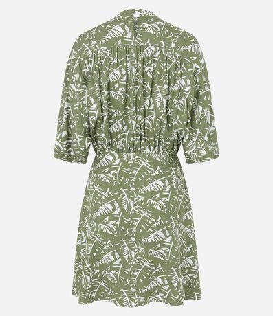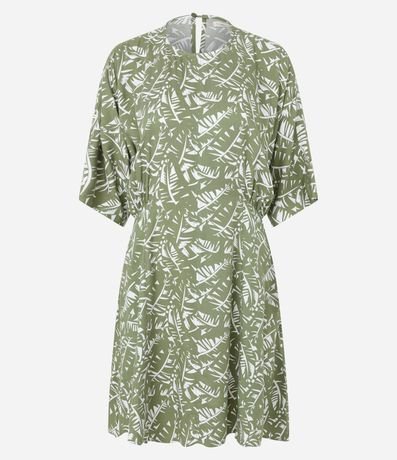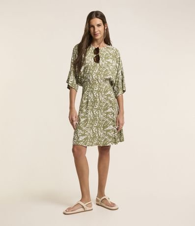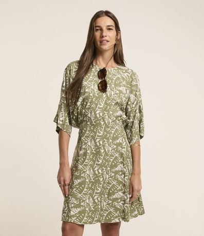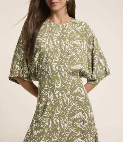 Ref: Vestido feminino, confeccionado em viscose twill, com gola redonda, mangas curtas, recorte drapeado nas costas e estampa folhagens.