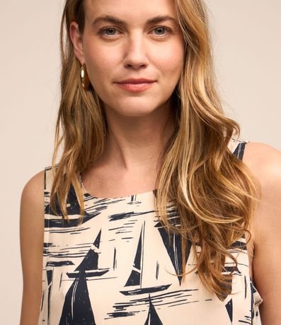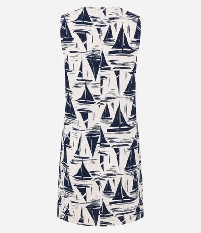 Vestido feminino, confeccionado em viscose, com gola redonda, sem mangas, zíper nas costas e estampa barquinhos.