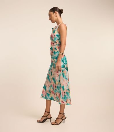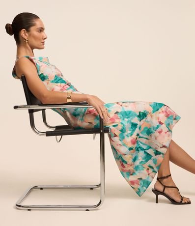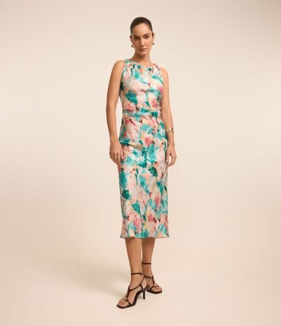 Vestido evasê midi confeccionado em tecido acetinado, sem mangas, com decote franzido além de flores estampadas em estilo aquarelado.