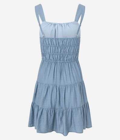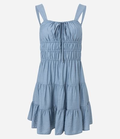 Ref: Vestido feminino confeccionado em viscose certificada no modelo curto evasê com decote reto, alças médias, amarração, costura enrugadinha na cintura e babados.