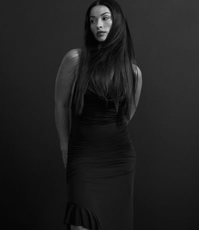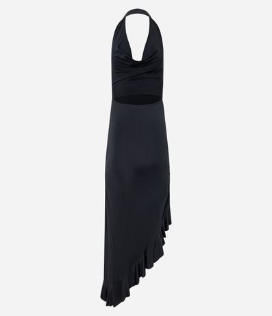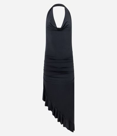 Vestido evasê, curto, frente única com alça larga, confeccionado com elastano e barra assimétrica ondulada.