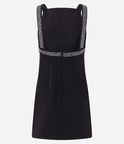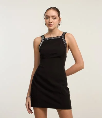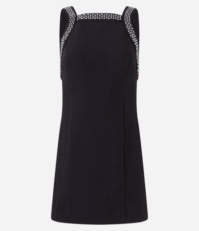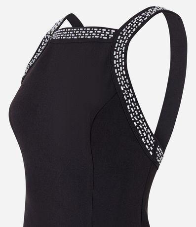 Vestido evasê, curto com alça larga, decote halter com brilhos aplicados e fechamento por zíper nas costas.
