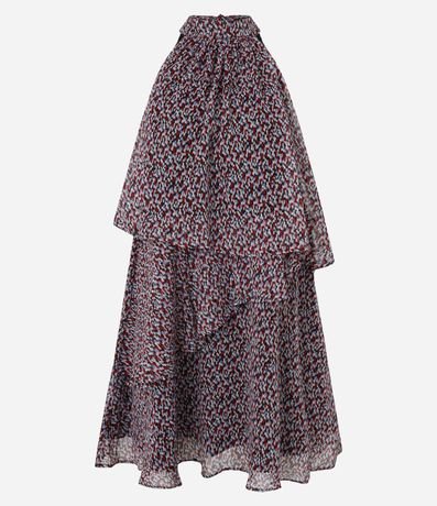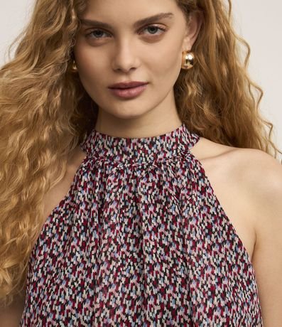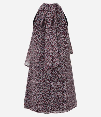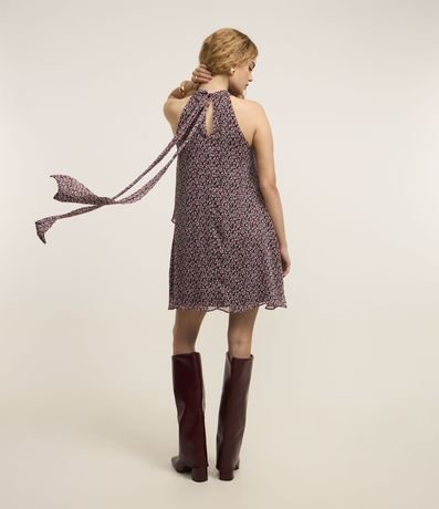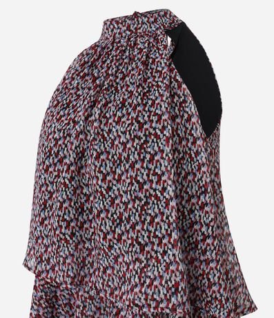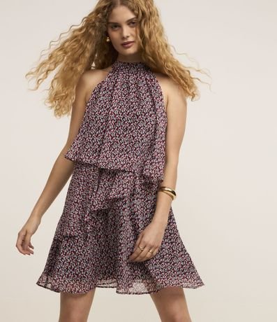 Ref: Vestido evasê curto confeccionado em chiffon, através de processo mais sustentável por boas práticas ambientais. Dispõe de gola halter com amarração de laço no pescoço além de babado sobreposto no busto. Estampado com peqeunas formas abstratas coloridas.