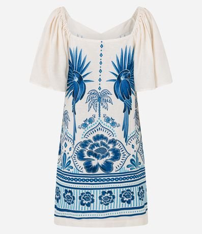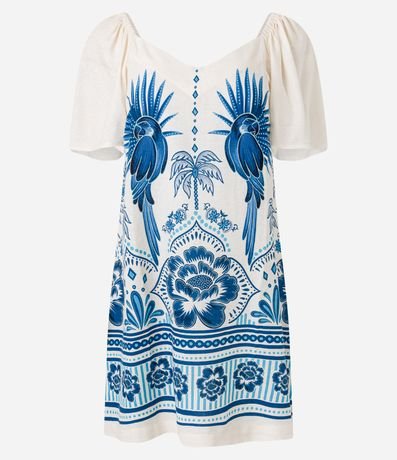 Ref: Vestido feminino confeccionado em linho com viscose certificada, peça no modelo evasê curto, manga curta e estampa tropical.