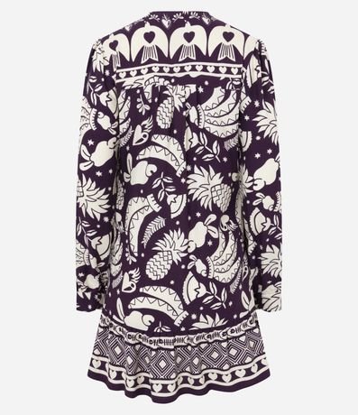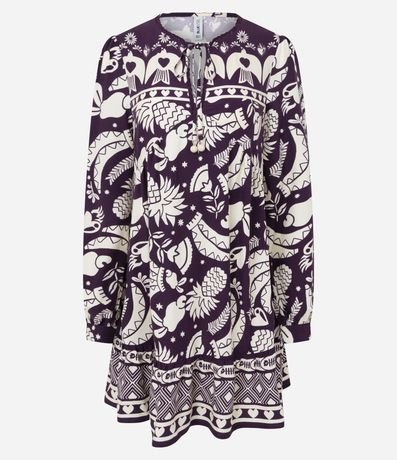 Vestido curto evasê em viscose, com manga longa e gola redonda. Traz estampa abstrata e detalhe de entremeio no decote, criando um visual delicado e contemporâneo. Peça confortável e versátil para compor produções casuais, confeccionado em viscose certificada.
