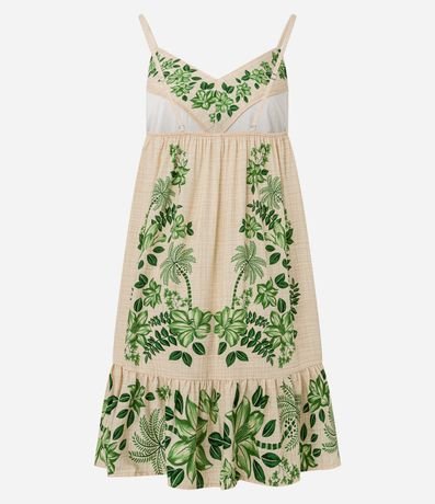 Ref: Vestido evasê curto, sem mangas de alças finas reguláveis, barra franzida e estampa de folhagens. Este produto possui viscose certificada em sua composição, sendo ambientalmente mais responsável.
