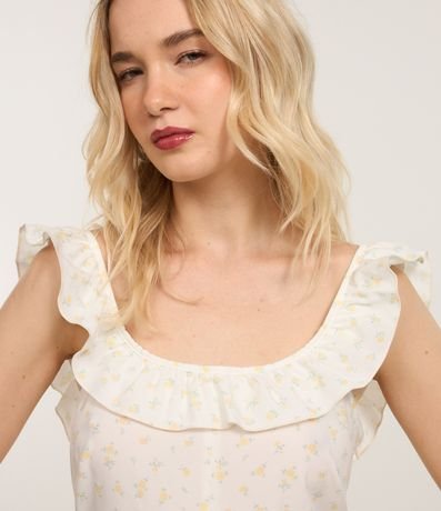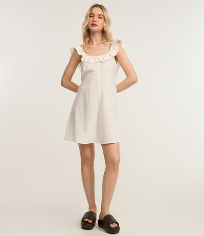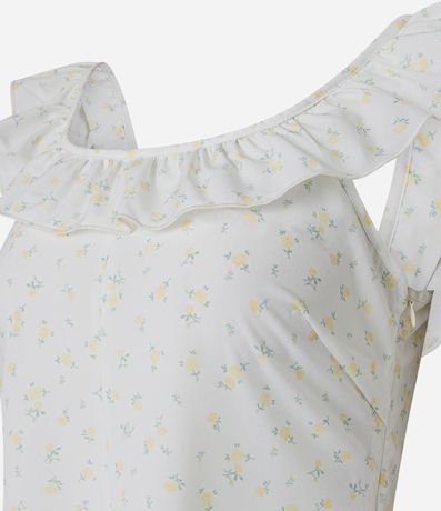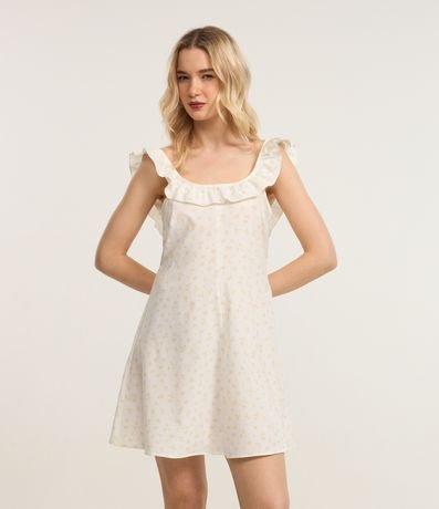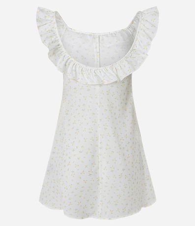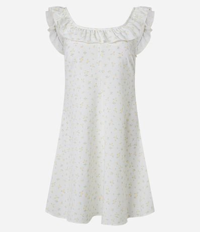 Ref: Vestido feminino confeccionado em microfibra através de boas práticas ambientais, no modelo evasê. Possui decote quadrado, alças largas, com frufru e estampa floral.