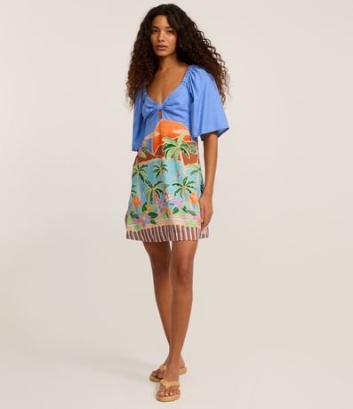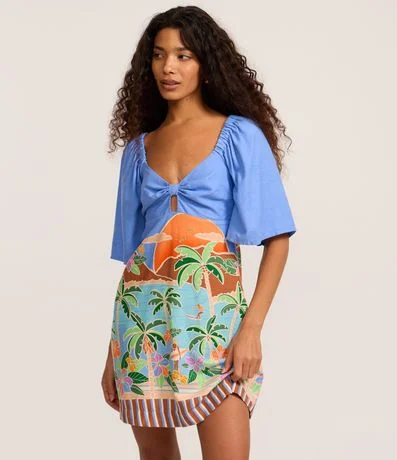 Ref: Vestido feminino confeccionado em viscolinho mais sustentável, no modelo evasê. Possui decote v, com amarração, detalhe vazado e estampa tropical.