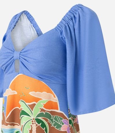 Vestido Evasê em Viscolinho com Amarração no Busto e Estampa Tropical
