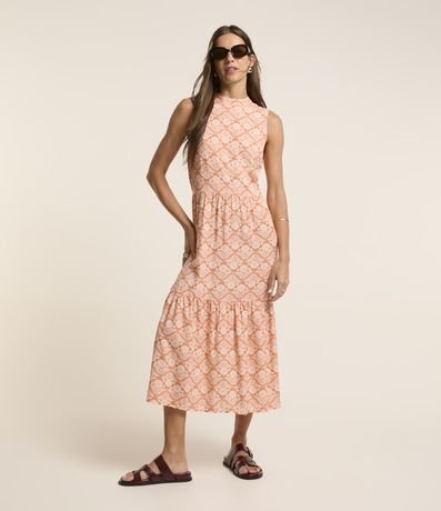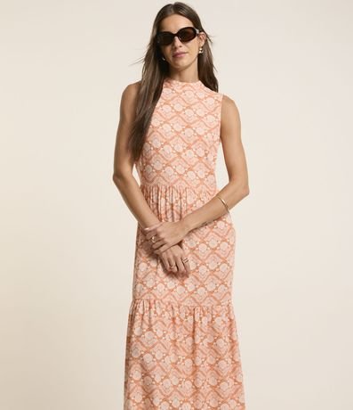 Ref: Vestido sem manga, evasê com decote halter, confeccionado em viscose e com estampa floral liberty.