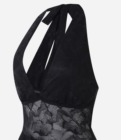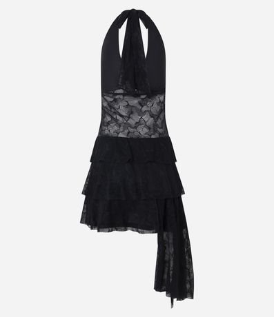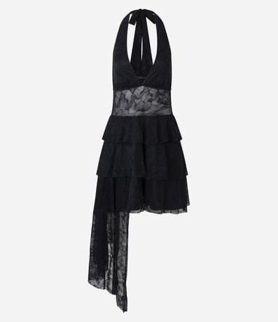 Vestido Evasê Frente Única em Renda com Decote V e Barra Assimétrica
