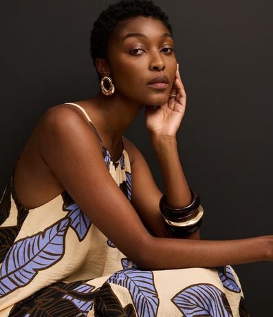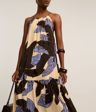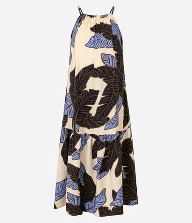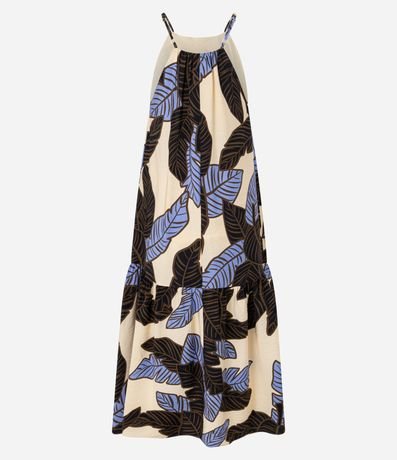Vestido Evasê Frente Única em Viscose com Estampa Folhagem