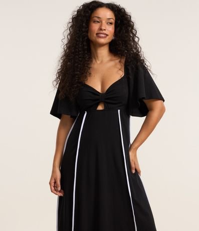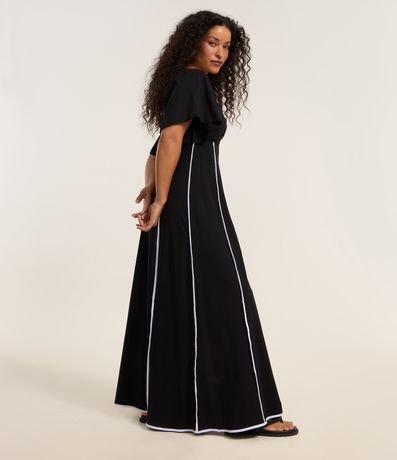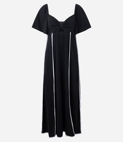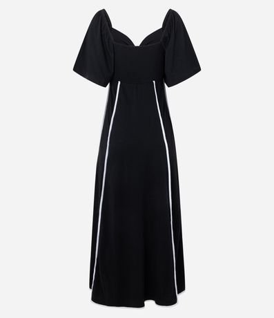 Vestido evasê long midi de mangas bufantes curtas, confeccionado em algodão, com decote laço e vieses contrastantes. Este produto possui algodão certificado em sua composição, sendo ambientalmente mais responsável.