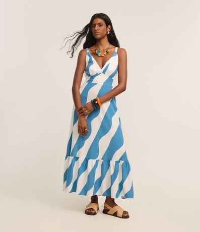 Vestido evasê long midi, sem mangas, confeccionada em viscolinho, com decote V, lastex nas costas, recorte franzido na barra e listras largas diagonais. Peça com forro. Este produto possui viscose certificada em sua composição, sendo ambientalmente mais responsável.