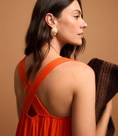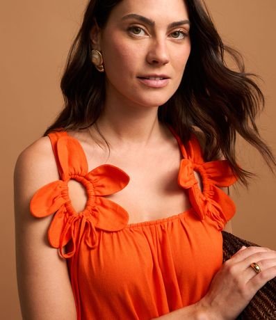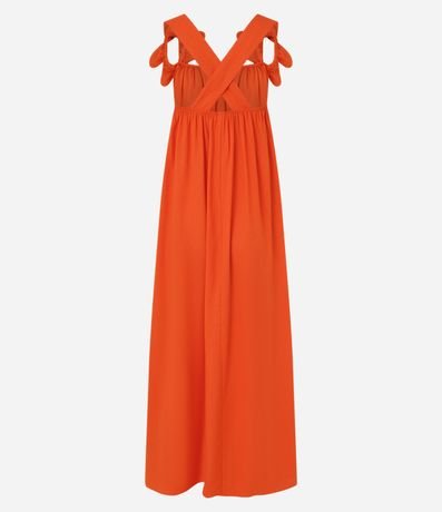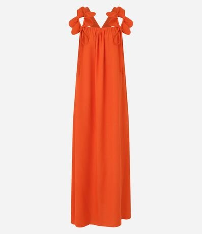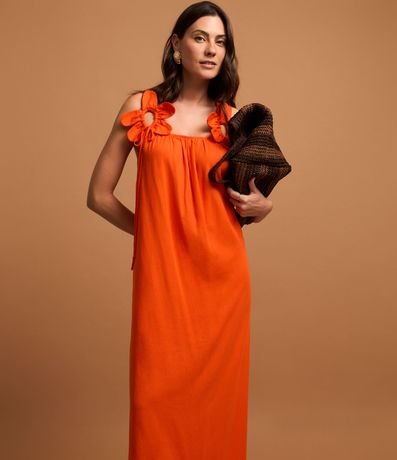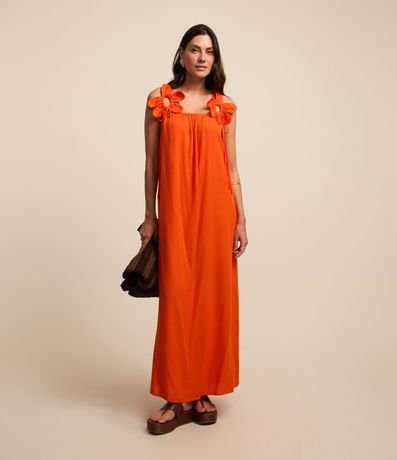 Ref: Vestido evasê longo midi confeccionado em viscose com decote quadrado, alças largas cruzadas com flores aplicadas.