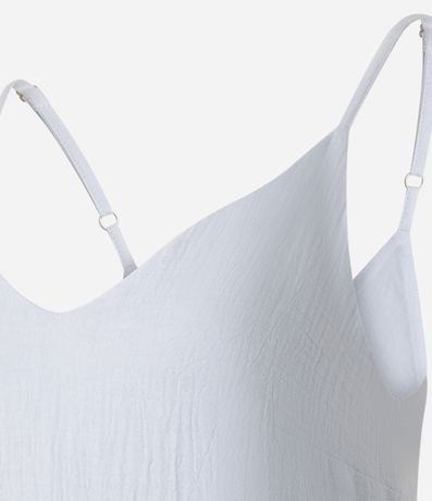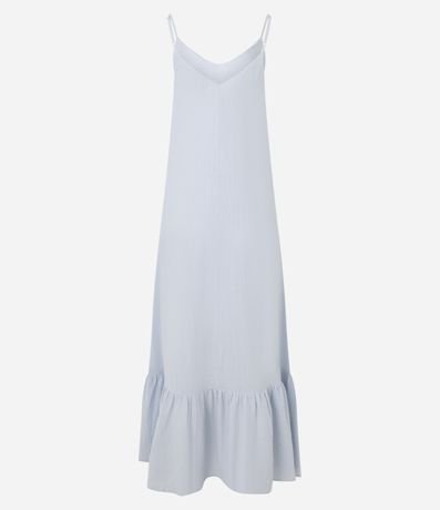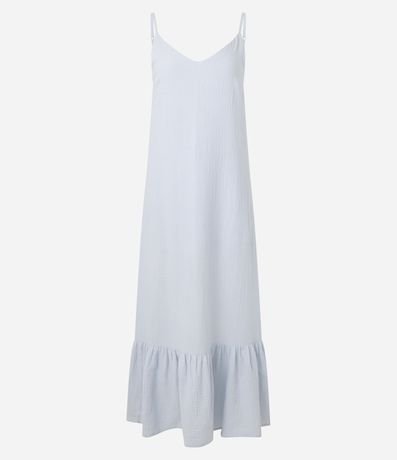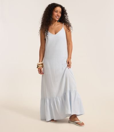 Ref: Vestido evasê longo de alcinhas finas reguláveis, confeccionado em cambraia com efeito de textura amassada, com recorte franzido na barra. Peça com forro. Este produto possui material mais sustentável em sua composição, sendo ambientalmente mais responsável.
