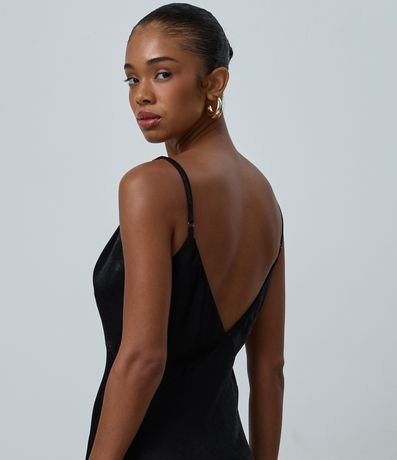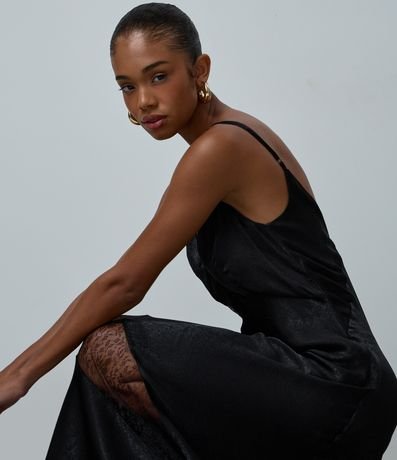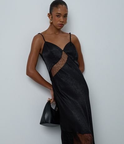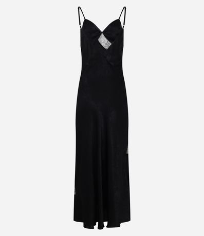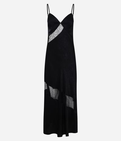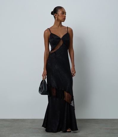 Vestido feminino confeccionado em cetim no modelo evasê longo com decote em v, alças finas, detalhe de renda com transparência e textura.