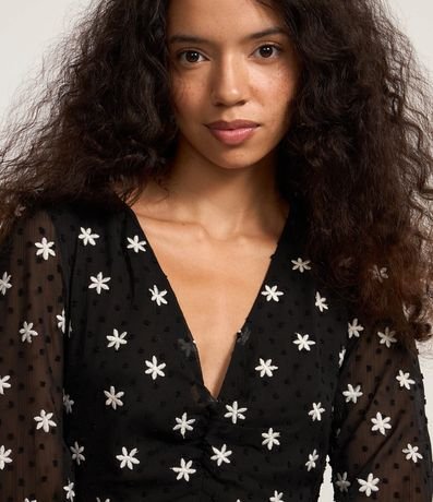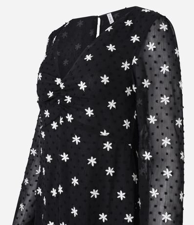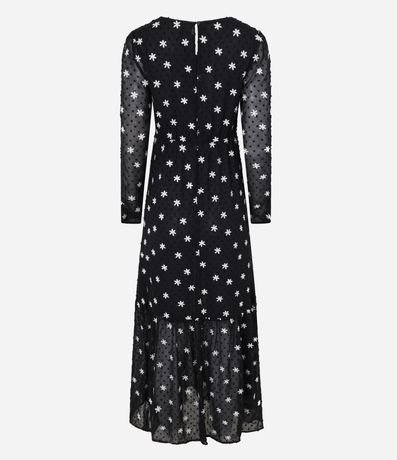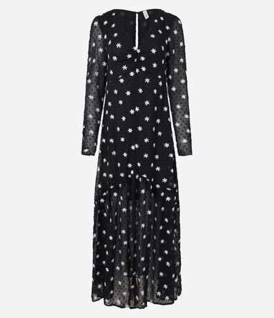 Vestido longo, evasê com manga longa, confeccionado em chiffon e com bordados de florzinhas.