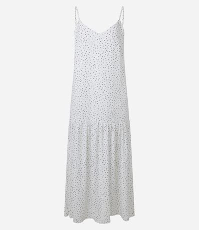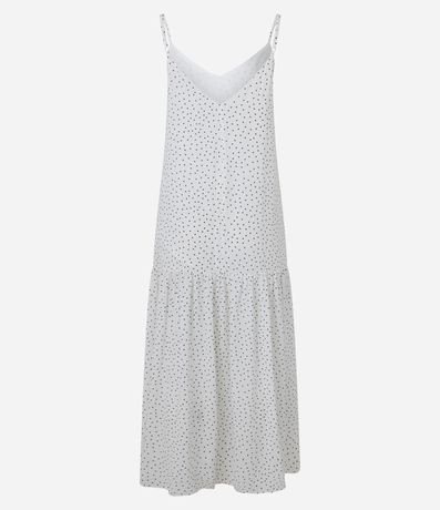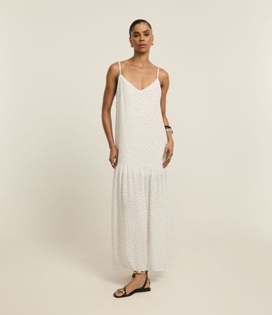 Vestido feminino de modelo evasê, confeccionado em crepe, de comprimento longo, com decote V e alças finas reguláveis. Possui padronagem poá e babados Marias na saia.