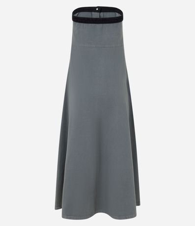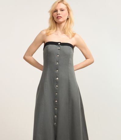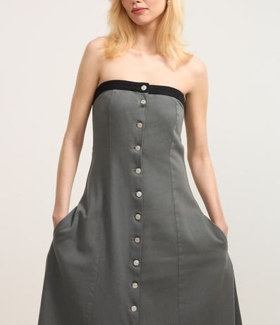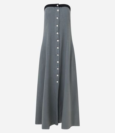 Ref: Vestido evasê, longo, confeccionado em sarja com decote tomara que caia e abotoamento frontal.
