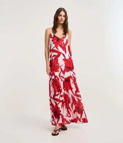 Ref: Vestido evasê longo, confeccionado em viscose, com decote V, alças finas, recorte franzido na saia e estampa floral. Peça bicolor e com forro. Este produto possui viscose certificada em sua composição, além de ter sido produzido através de processos mais sustentáveis, sendo ambientalmente mais responsável.