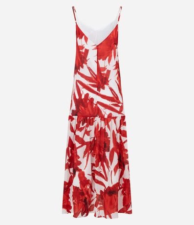 Vestido evasê longo, confeccionado em viscose, com decote V, alças finas, recorte franzido na saia e estampa floral. Peça bicolor e com forro. Este produto possui viscose certificada em sua composição, além de ter sido produzido através de processos mais sustentáveis, sendo ambientalmente mais responsável.