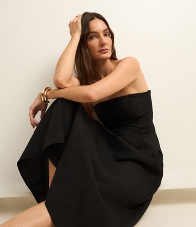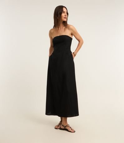 Vestido evasê longo e amplo, confeccionado em viscose com linho, com decote tomara que caia. Este produto foi fabricado através de processos mais sustentáveis, adotando boas práticas ambientais.