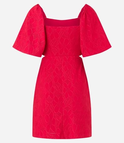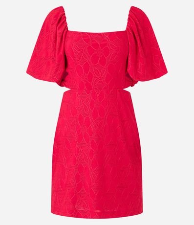 Vestido evasê curto, de mangas bufantes confeccionado em laise, com decote quadrado no busto e nas costas além furinhos vazados pela malha e bordados de flores.