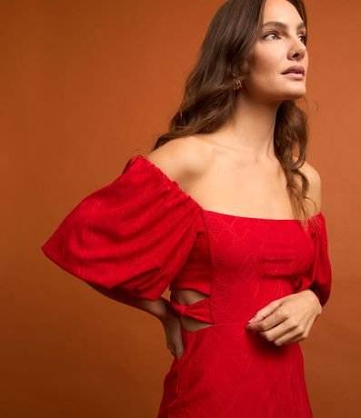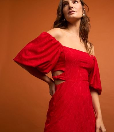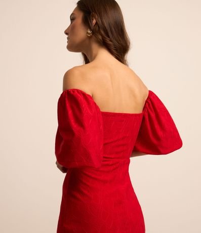 Vestido Evasê Manga Bufante em Laise com Flores Texturizadas