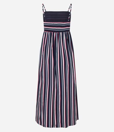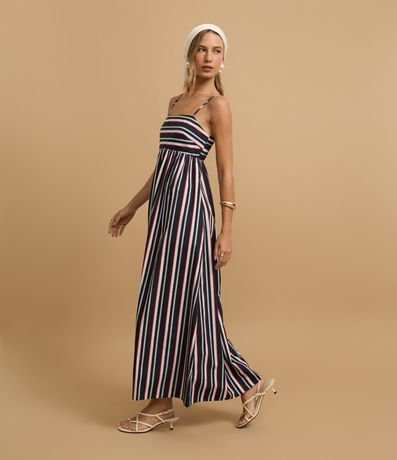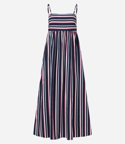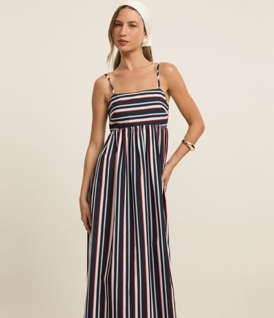 Ref: Vestido evasê midi e sem mangas, confeccionado em tecido plano com estrutura alfaiatada, com decote reto e alcinhas finas com reguladores. A roupa tem listras coloridas e recorte logo abaixo do busto, além de lastex nas costas. Este produto possui algodão certificado BCI em sua composição, sendo ambientalmente mais responsável.
