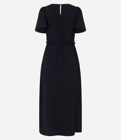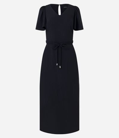 Ref: Vestido evasê midi de mangas curtas bufantes com gola V com fechamento por gota além de passantes e cinto para amaração na cintura. Conta com tecido com efeito airflow que confere um aspecto amassado e sofisticado.