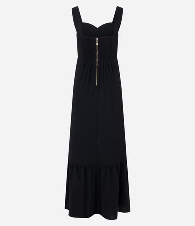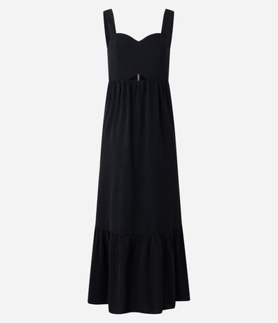 Ref: Vestido evasê midi, confeccionado em airflow, com decote coração, abertura abaixo do busto, alças largas, fechamento por zíper nas costas e recorte franzido na barra.