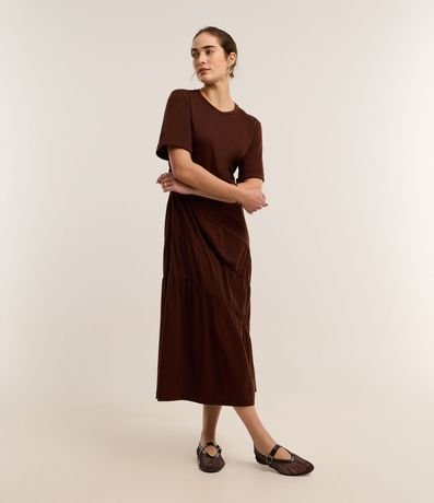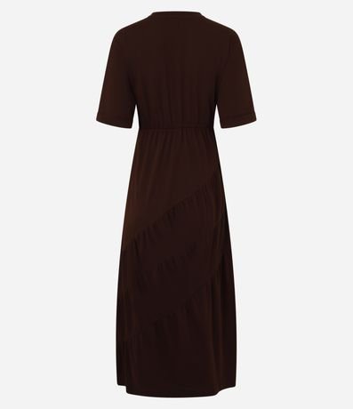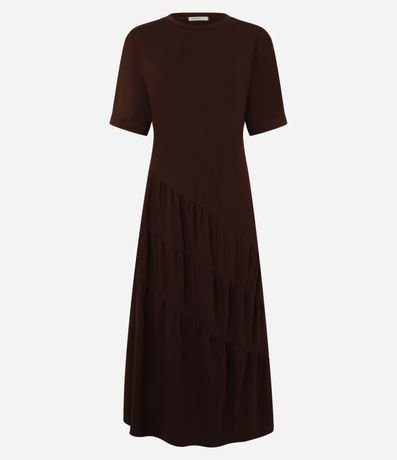 Ref: Vestido evasê longo, confeccionado em algodão, com gola redonda, mangas curtas e recorte diagonal na saia com efeito espiral e franzido. Este produto possui algodão certificado BCI em sua composição, além de ter sido produzido através de processos mais sustentáveis com boas práticas ambientais, sendo ambientalmente mais responsável.