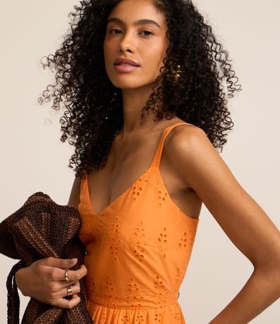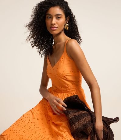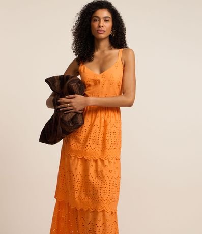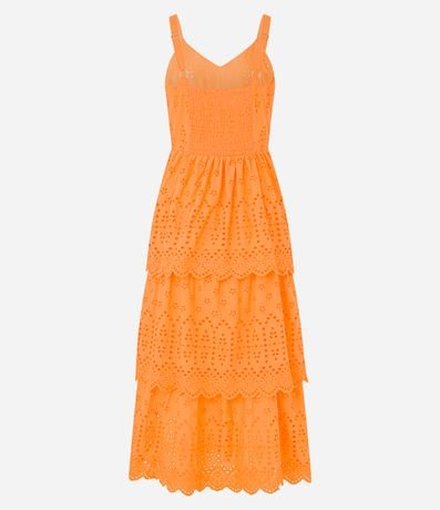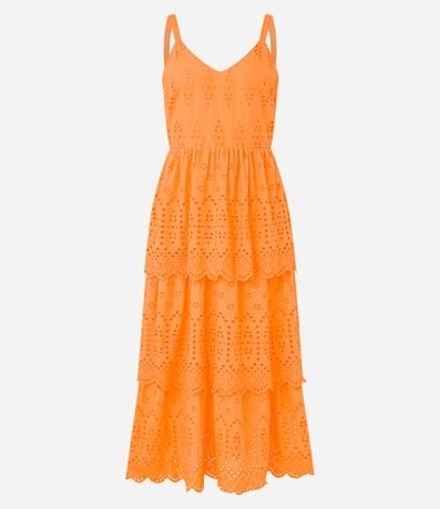 Ref: Vestido evasê midi de alças largas reguláveis confeccionada em laise com lastex nas costas e camadas sobrepostas na saia.