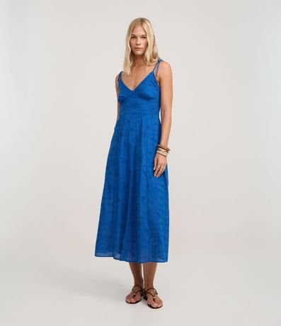 Ref: Vestido evasê midi, sem mangas, confeccionado em laise, com decote V, alças finas com amarrações, busto marcado com franzidos, recorte na cintura e bordados vazados. Peça com forro. Este produto possui material mais sustentável em sua composição, sendo ambientalmente mais responsável.