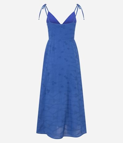 Ref: Vestido evasê midi, sem mangas, confeccionado em laise, com decote V, alças finas com amarrações, busto marcado com franzidos, recorte na cintura e bordados vazados. Peça com forro. Este produto possui material mais sustentável em sua composição, sendo ambientalmente mais responsável.