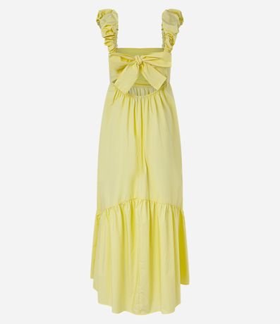 Ref: Vestido evasê midi confeccionado em tricoline com decote quadrado, alças largas com efeito franzido e recorte franzido na região da barra.
