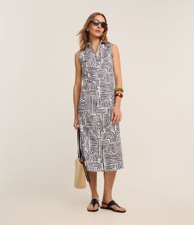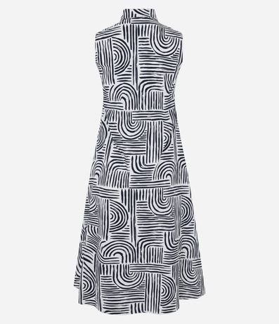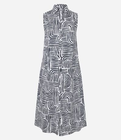 Ref: Vestido evasê midi e sem mangas, confeccionada em tricoline, com golinha alta e estampa geométrica com formas curvas. Este produto possui algodão certificado em sua composição, sendo ambientalmente mais responsável.