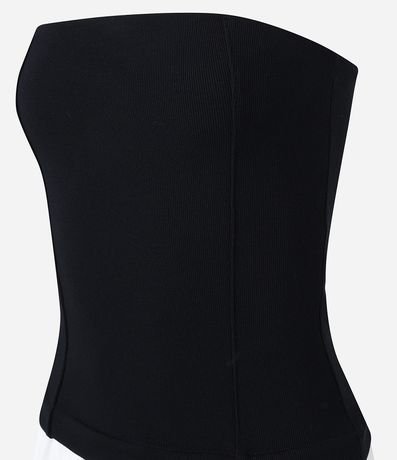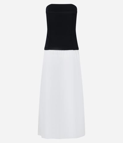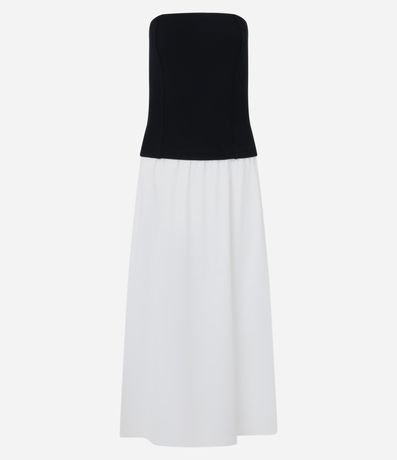 Ref: Vestido midi, evasê com decote tomara que caia, confeccionada com saia em tricoline. Bicolor e possui pregas na cintura.